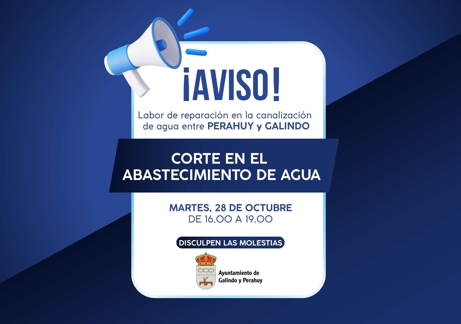 El Ayuntamiento de Galindo y Perahuy informa a todos los vecinos que hoy, martes, 28 de octubre de 2025, se realizarán trabajos de reparación en la tubería de abastecimiento de agua situada entre Perahuy y Galindo.