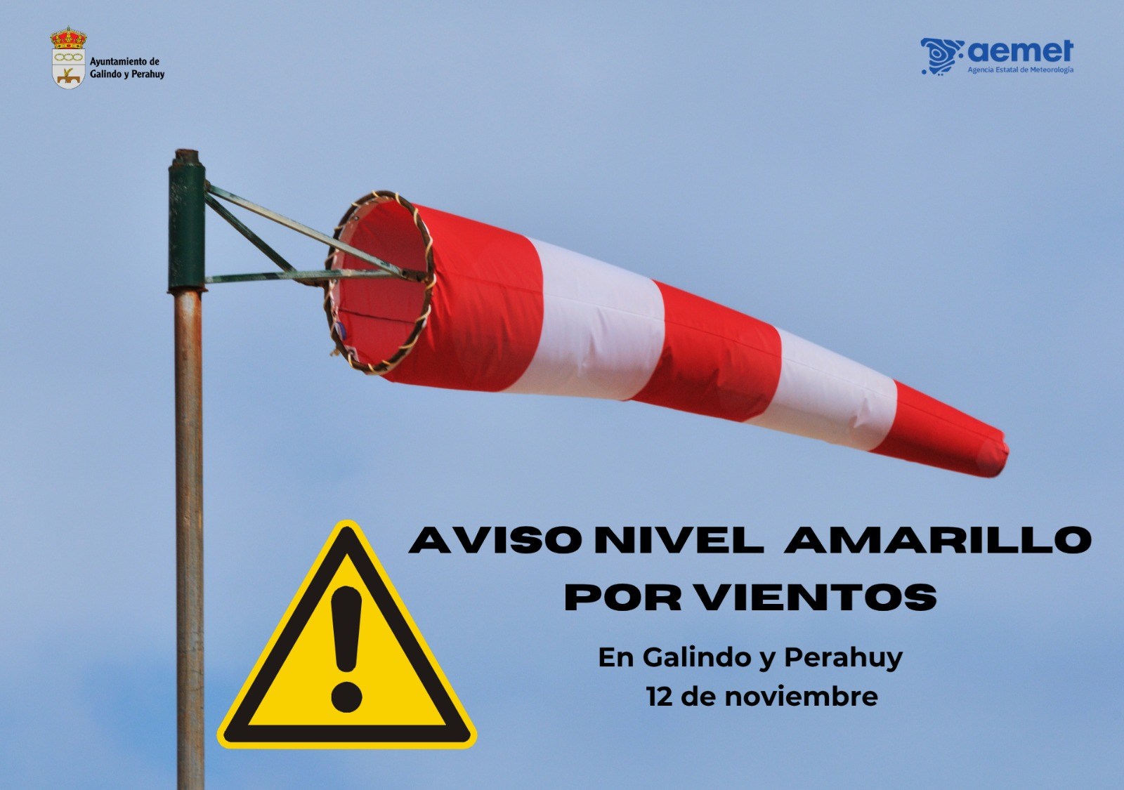 El Centro Coordinador de Emergencias de Protección Civil de la Junta de Castilla y León (JCyL) ha comunicado que la Agencia Estatal de Meteorología (AEMET) ha declarado aviso de nivel amarillo por fuertes vientos en la Meseta de Salamanca durante la jornada de este miércoles, 12 de noviembre, afectando también al término municipal de Galindo y Perahuy.