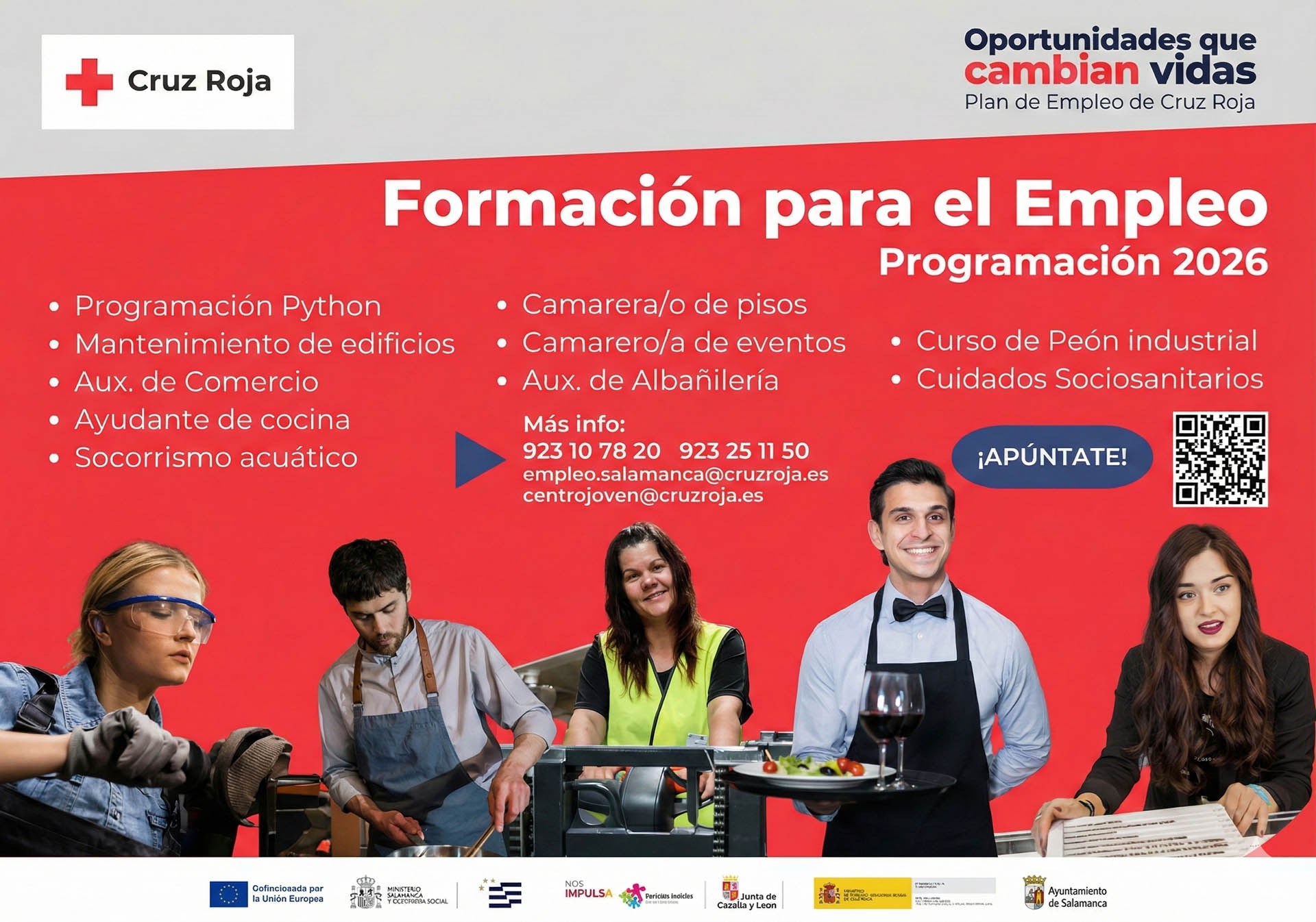 Cruz Roja en Salamanca impulsa para 2026 un completo programa de Formación para el Empleo dirigido a personas que quieran mejorar su cualificación profesional y sus oportunidades de acceso al mercado laboral. Se trata de acciones formativas prácticas, adaptadas a perfiles muy demandados por las empresas y con el acompañamiento especializado del Plan de Empleo de Cruz Roja.